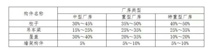 各種構(gòu)件的用鋼量占整個(gè)廠房鋼結(jié)構(gòu)的總用鋼量的比值大致如表所示。