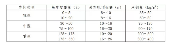 廠房按單位面積計(jì)算的用鋼量,是評(píng)定設(shè)計(jì)的經(jīng)濟(jì)合理性的一項(xiàng)重要指標(biāo)。各類廠房單位面積用鋼量的統(tǒng)計(jì)數(shù)值見下表