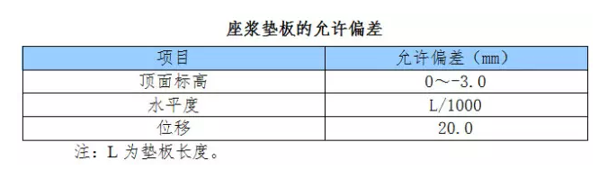 b. 宜根據(jù)測(cè)得的柱底面至牛腿距離決定每個(gè)基礎(chǔ)墊板的頂面標(biāo)高,座漿墊板的標(biāo)高、水平度和定位的允許偏差應(yīng)符合下表的規(guī)定。