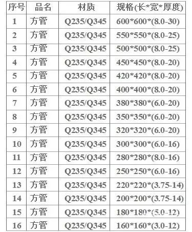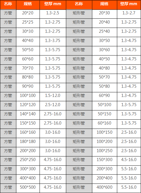 方管規(guī)格尺寸及方管規(guī)格表大全。