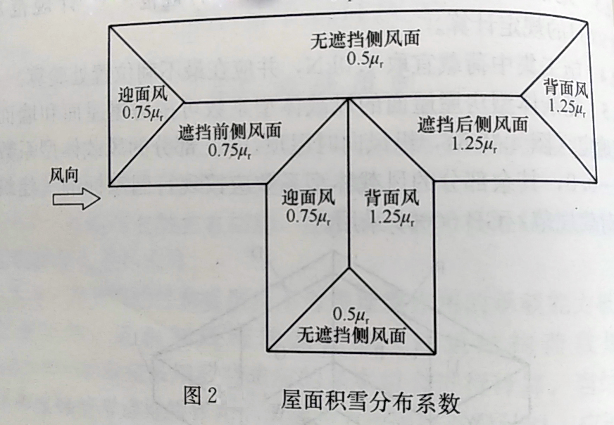 ƒ對側(cè)風(fēng)面屋面:在屋面無遮擋情況時(shí),側(cè)風(fēng)面屋面積雪分布系數(shù)取0.5µr;在屋面有遮擋情況時(shí),遮擋前側(cè)風(fēng)面積雪分布系數(shù)取0.75µr;遮擋后側(cè)風(fēng)面屋面積雪分布系數(shù)取1.25µr。