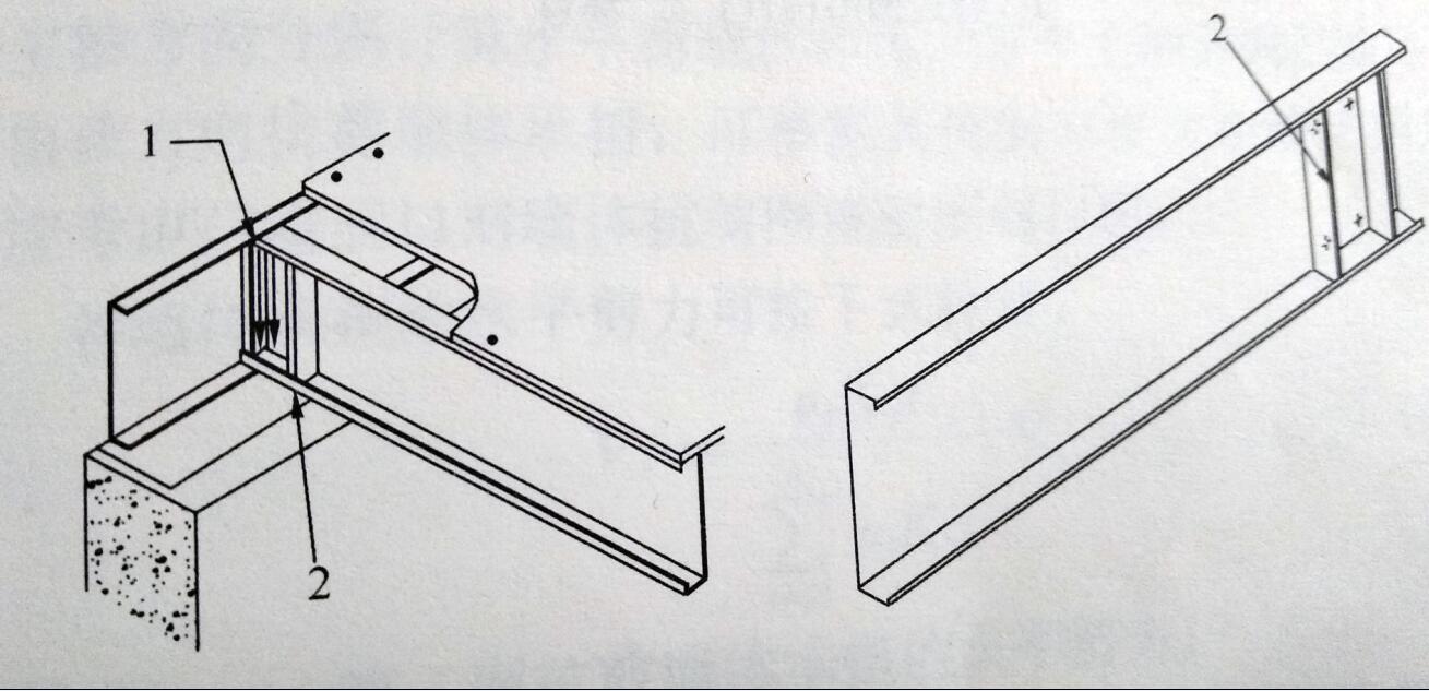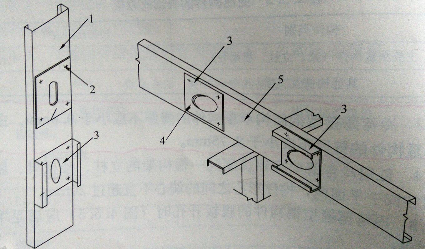 7、在構(gòu)件支座和集中荷載作用處,應(yīng)設(shè)置腹板加勁件。加勁件可采用厚度不小于1.0mm的槽形構(gòu)件和卷邊槽形構(gòu)件,且其高度宜為被加勁構(gòu)件腹板高度減去10mm。加勁件與構(gòu)件腹板之間應(yīng)采用螺釘連接(圖3)。螺釘應(yīng)布置均勻。