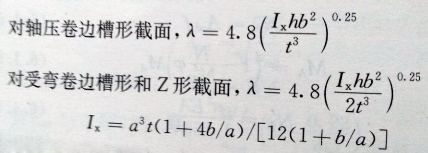 (2)構(gòu)件長度小于構(gòu)件畸變屈曲半波長(λ);畸變屈曲半波長可按下列公式計(jì)算:
