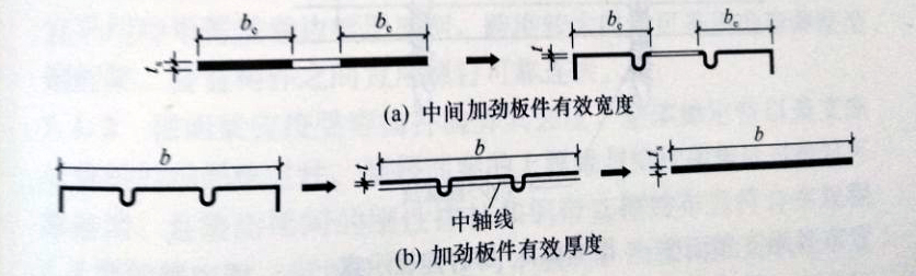 7 中間加勁板件寬度可按等效板件的有效寬度采用圖a。等效板件厚度圖b可按下式計(jì)算: