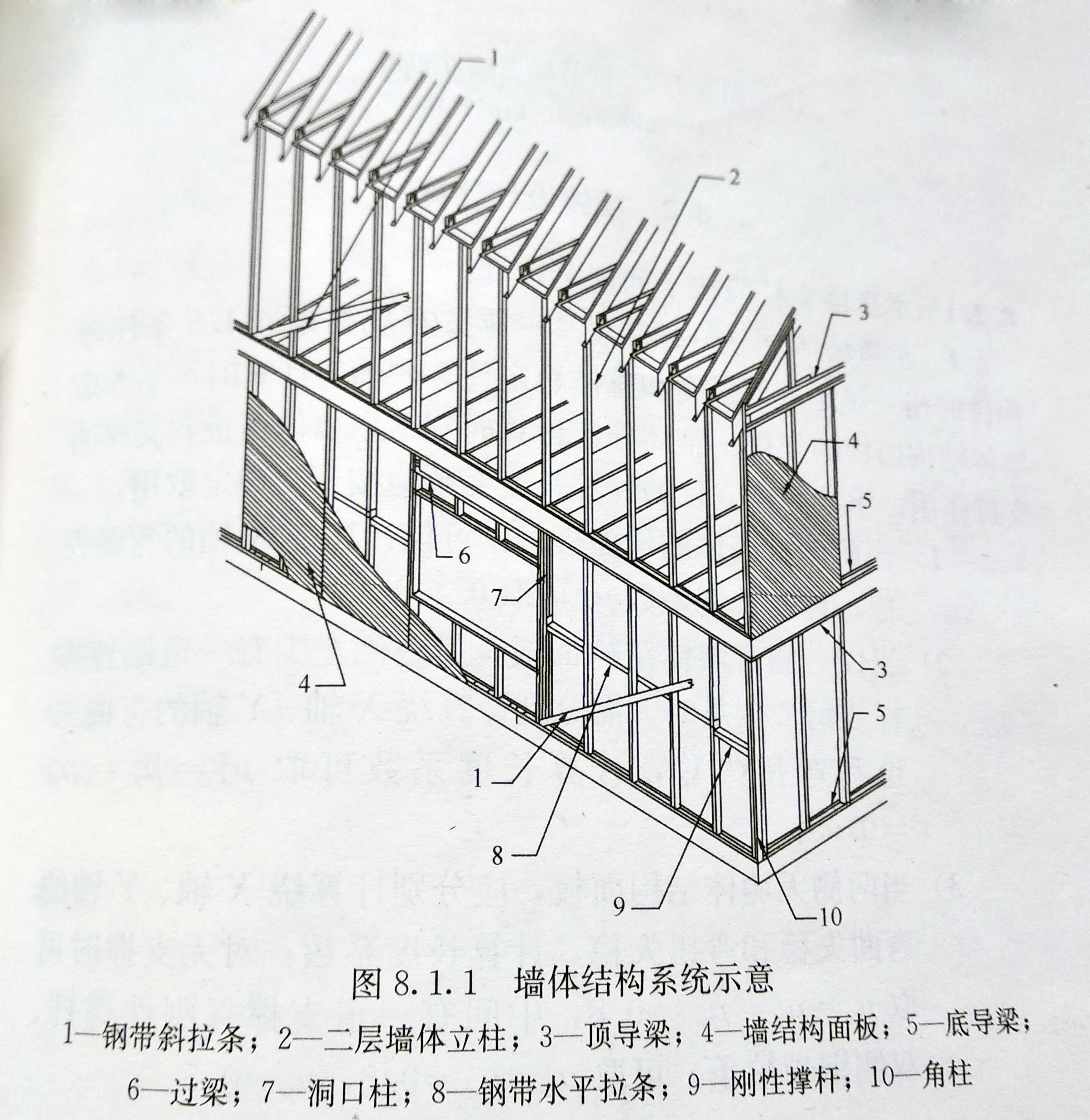 1、低層冷彎薄壁型鋼房屋墻體結構的承重墻應有立柱、頂導梁和底導梁、支撐、拉條和撐桿。墻體結構面板等部件組成(圖1)。非承重墻可不設置支撐、拉條和撐桿。 墻體立柱的間距宜為400mm到600mm。