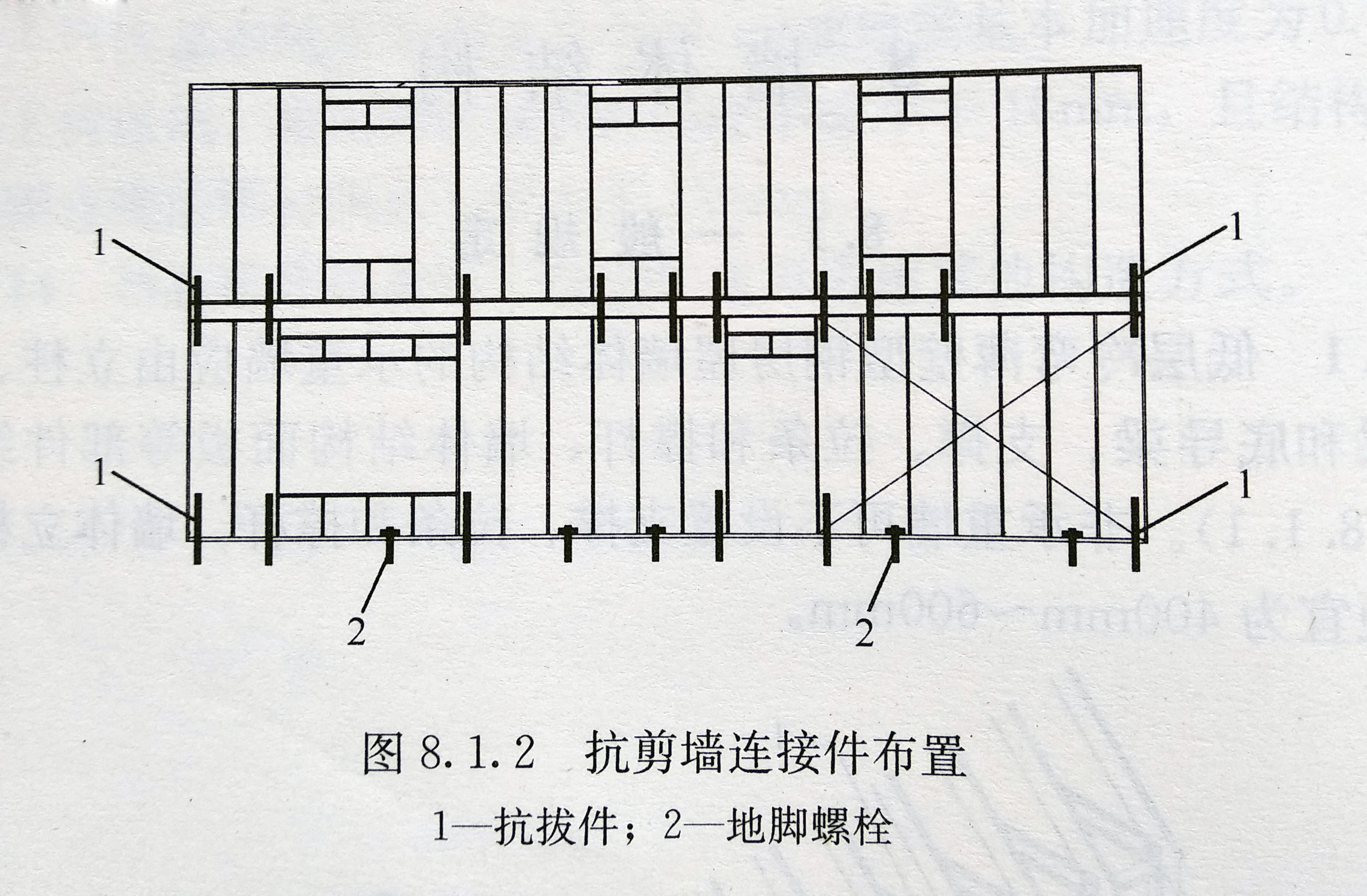 2、低層冷彎薄壁型鋼房屋結構的抗剪墻體,在上、下墻體間應設置抗拔件,與基礎間應設置地腳螺栓和抗拔件(圖2)。