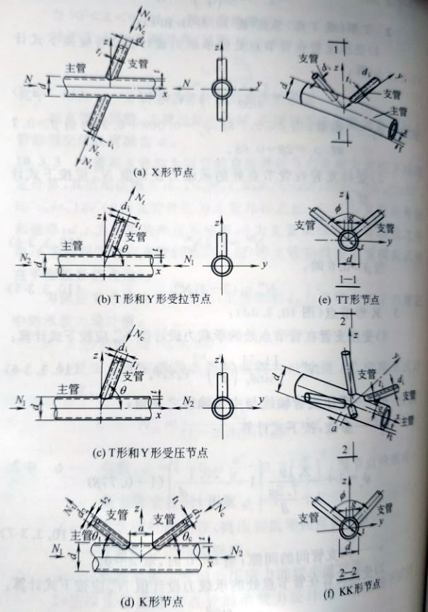 三、主管和支管均為圓管的直接焊接節(jié)點(diǎn)承載力應(yīng)按下列規(guī)定計(jì)算,其適用范圍為:0.2≤β≤1.0;di/ti≤60; d/t≤100, θ≥30°,60°≤Φ≤120°(β為支管外徑與主管外徑之比;di、ti為支管的外徑和壁厚;d、t為主管的外徑和壁厚;θ為支管軸線與主管軸線之夾角;Φ為空間管節(jié)點(diǎn)支管的橫向夾角,即支管軸線在主管橫截面所在平面投影的夾角)。